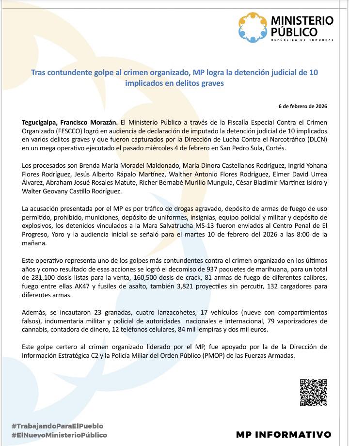 La acusación presentada por el MP es por tráfico de drogas agravado, depósito de armas de fuego de uso permitido, prohibido, municiones, depósito de uniformes, insignias, equipo policial y militar y depósito de explosivos, los detenidos vinculados a la Mara Salvatrucha MS-13 fueron enviados al Centro Penal de El Progreso, Yoro y la audiencia inicial se señaló para el martes 10 de febrero del 2026 a las 8:00 de la mañana.